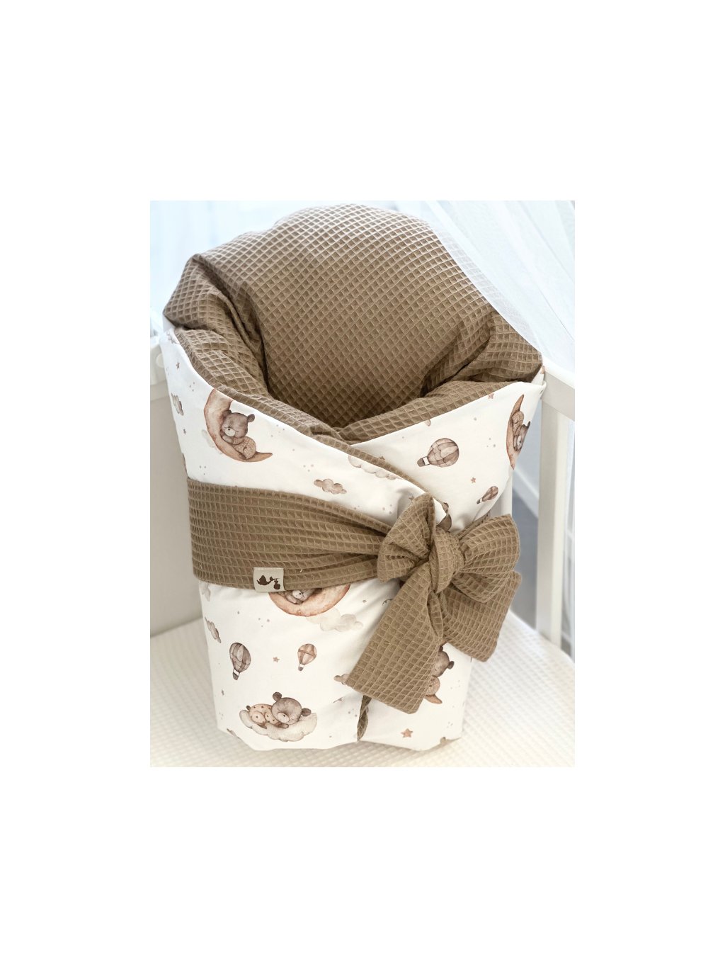 Krásně měkkoučká, nadýchaná, bavlněná péřová zavinovačka s roztomilým vzorem medvídků s hnědou vaflí.