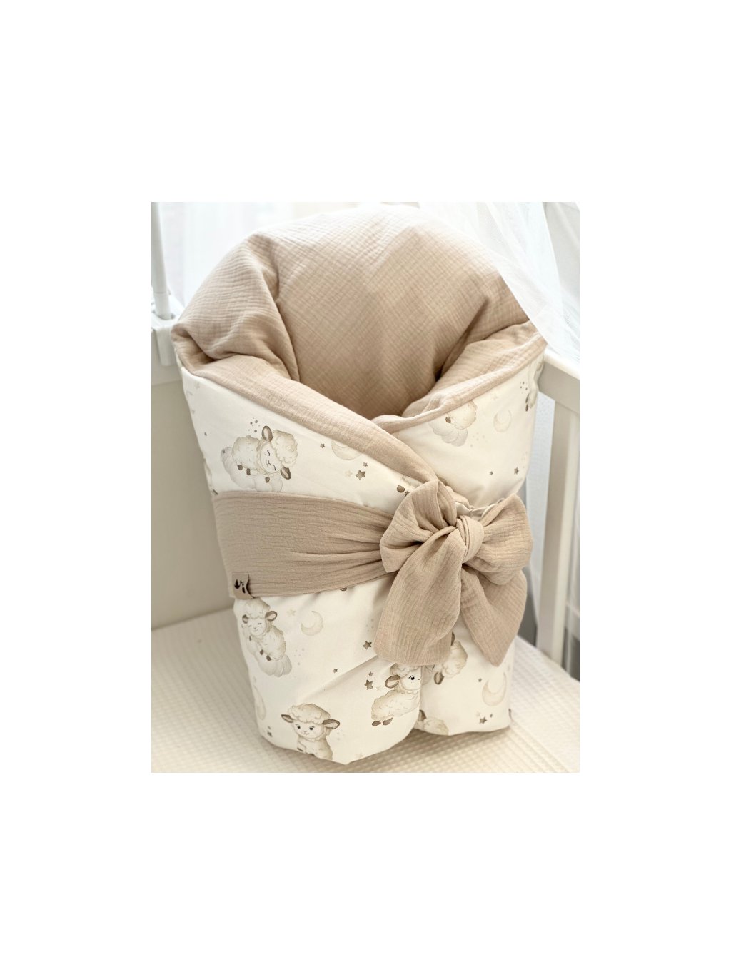 Luxusní krásně měkkoučká, nadýchaná, bavlněná péřová zavinovačka z béžového mušelínu a jemného vzoru oveček.