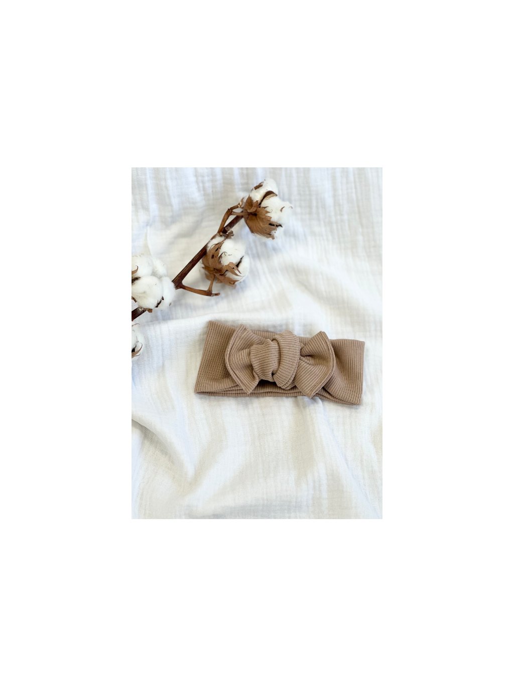 Jemná čelenka pro miminko z kvalitního žebrovaného úpletu v neutrální béžové barvě. Materiál je krásně pružný, měkký a prodyšný, takže je ideální pro citlivou pokožku miminek už od narození.