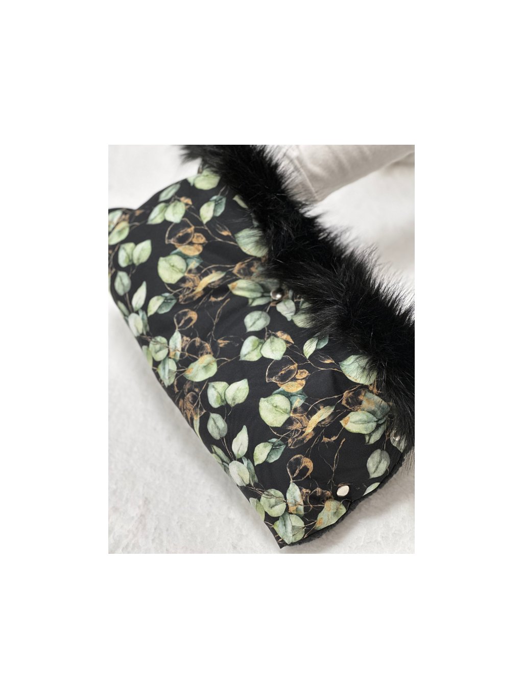 Rukávník snadno přichytíte k madlu kočárku díky kovovým drukům.