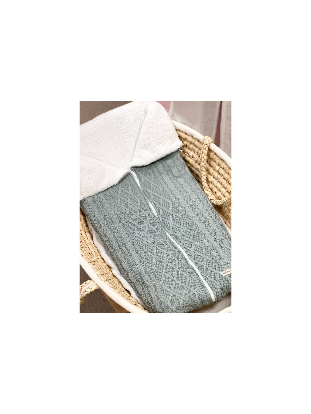 Stylový, zateplený jarní fusak do kočárku, který udrží vaše miminko v teple a pohodlí během chladnějších dnů. Kombinace elegantní starozelené pleteniny se vzorem v kombinaci s bílým beránkem