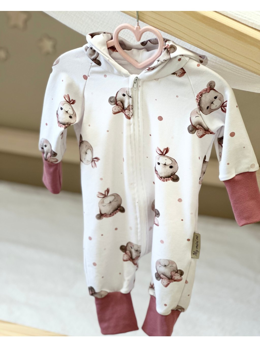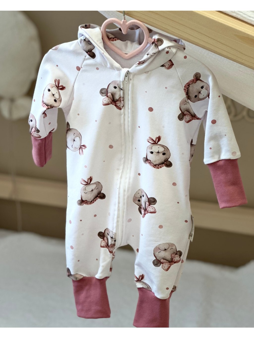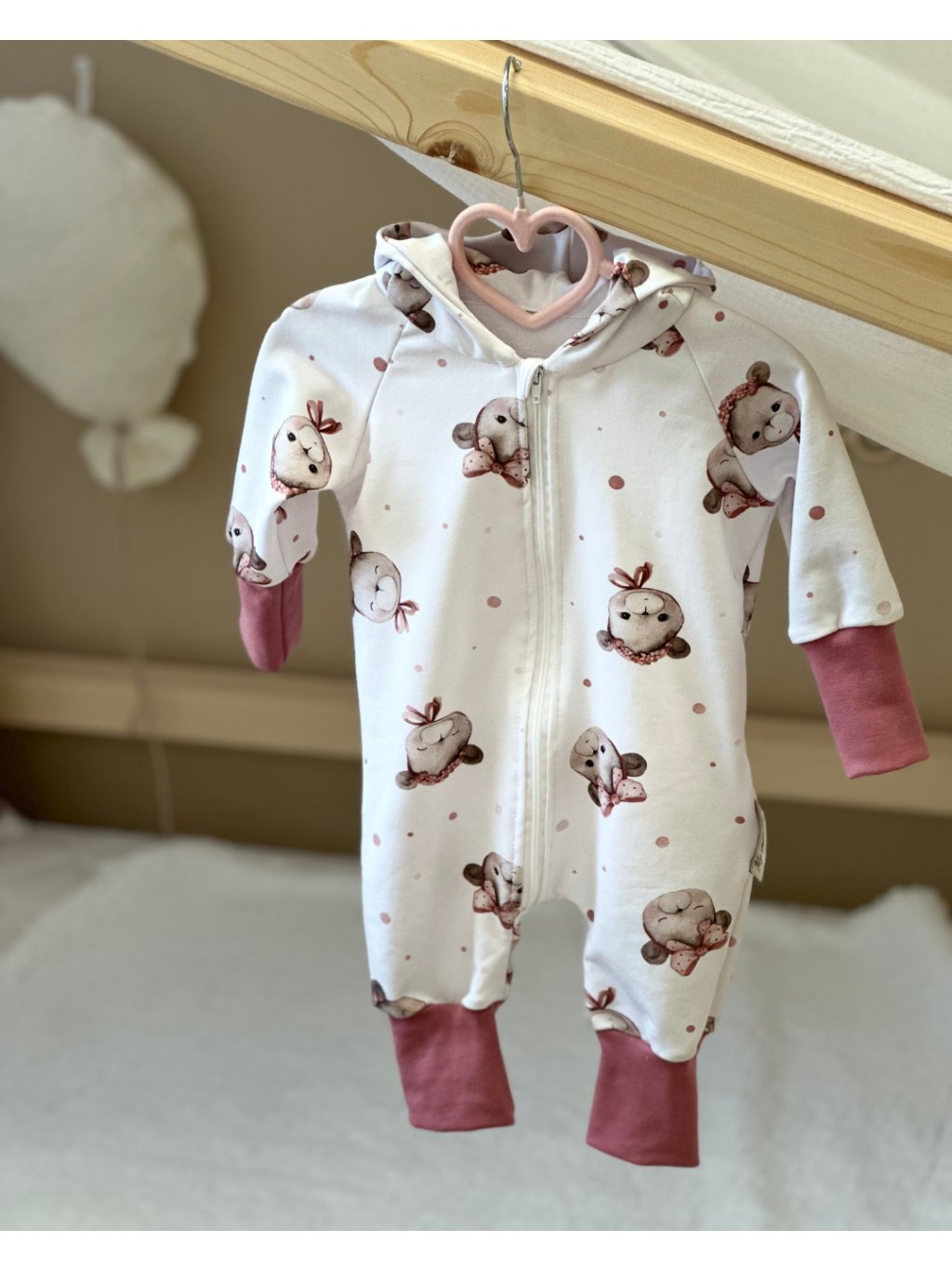 Tento měkoučký overalek z kvalitní bavlněné teplákoviny je nejen krásný, ale i praktický. Roztomilý potisk s medvídky a ouška na kapuci potěší každou maminku, a vaše miminko se v něm bude cítit jako v bavlnce.