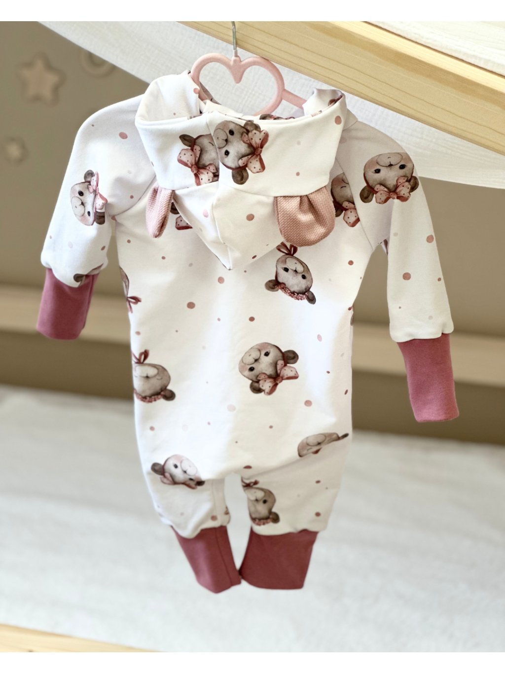 Stylový dětský overal z měkké bavlněné teplákoviny s medvídkovým motivem, oušky na kapuci a rostoucím střihem. Ideální jako pohodlná svrchní vrstva na jaro i podzim.