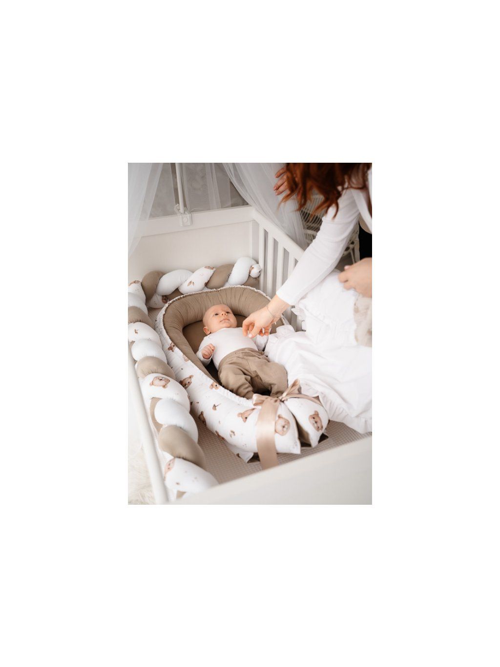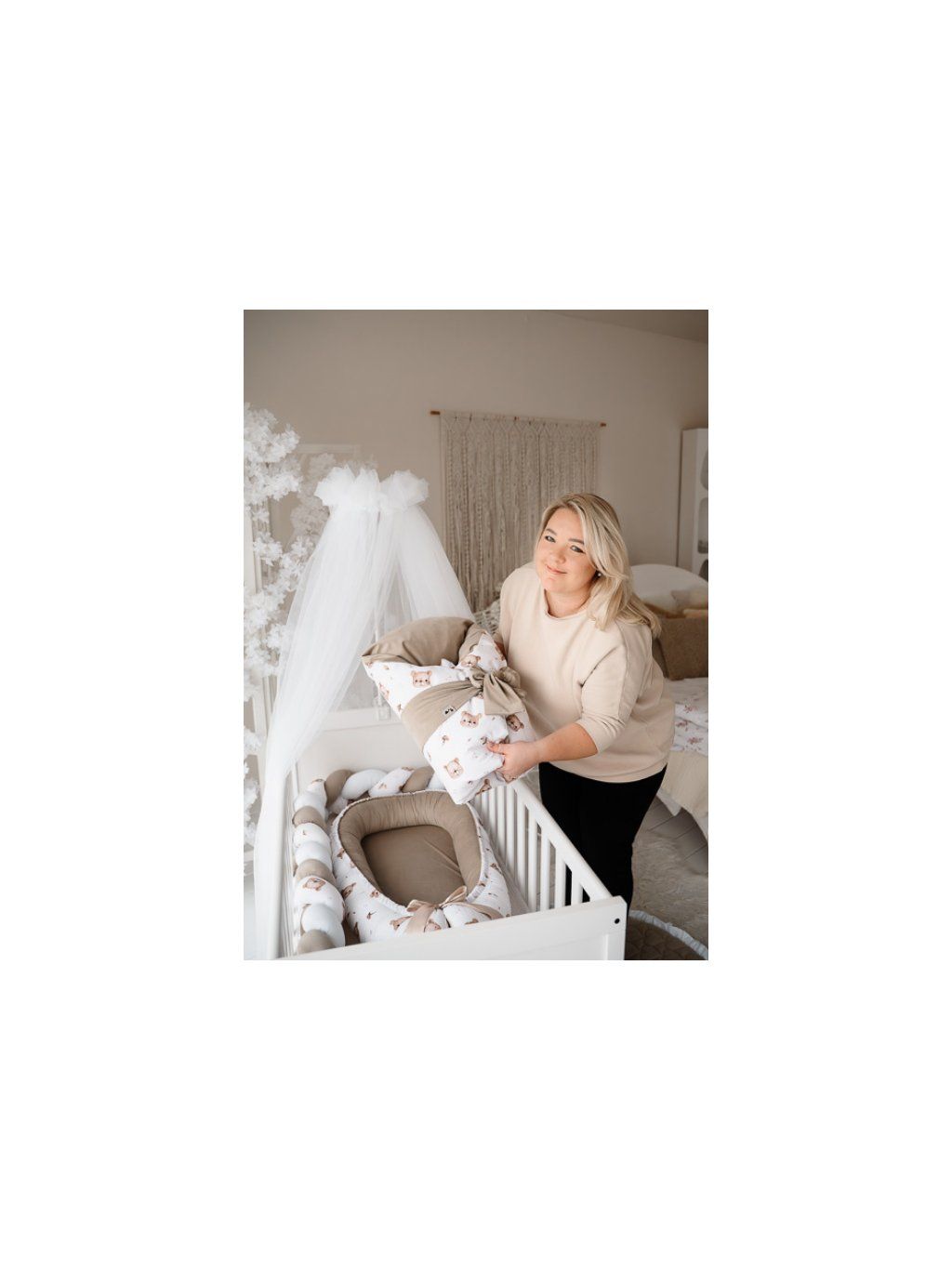 Set do postýlky - béžový s medvídky set s hnízdečkem, copánkovým mantinelem a zavinovačkou ve vzoru bestseller