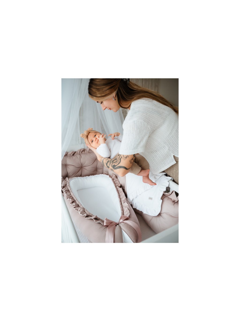 Set do postýlky v elegantní kombinaci starorůžového velvetu a bílé bavlny. U zavinovačky si lze vybrat ze tří variant. Klasická zavinovačka, péřová, nebo nadýchaná á la péřová, která je na první pohled stejná jako péřová, ale je vhodná i pro alergiky.