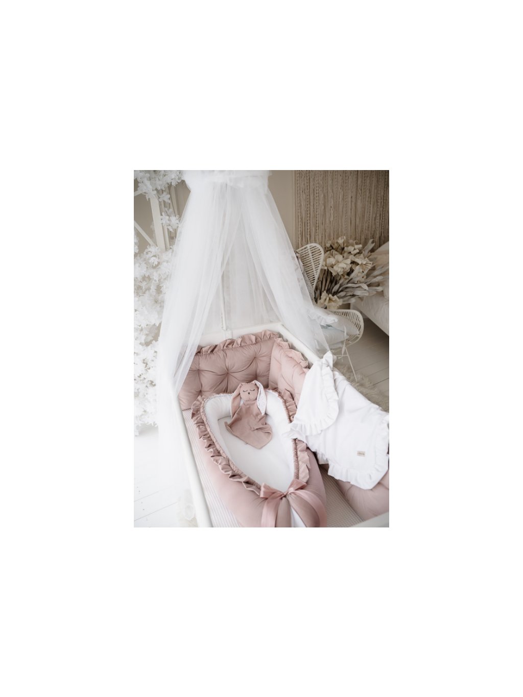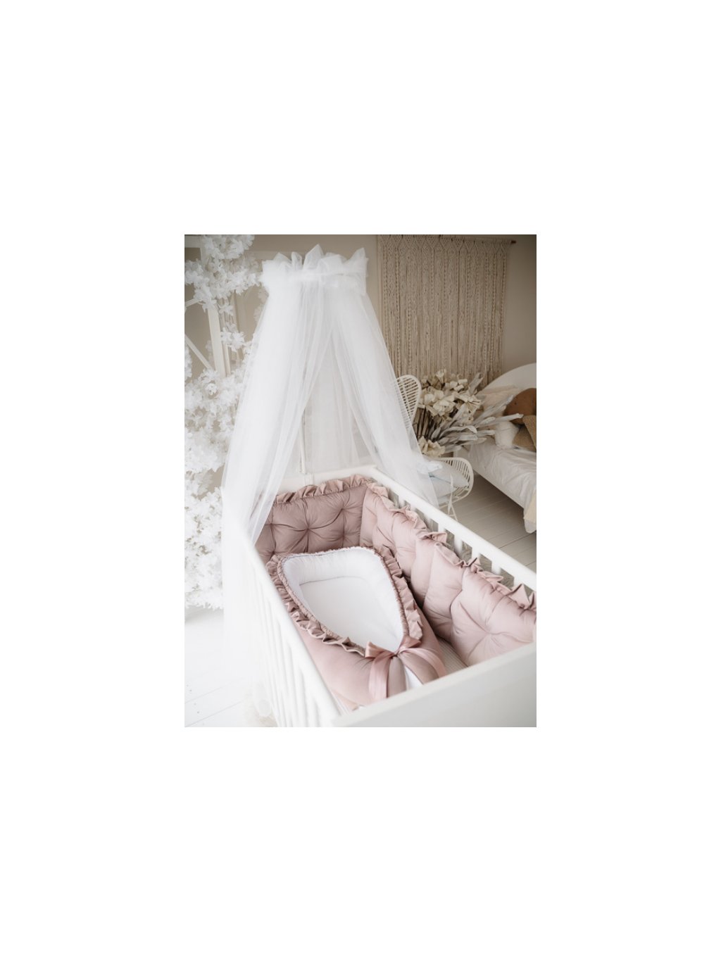 Starorůžový set do postýlky se skládá z hnízdečka s volánkem, zavinovačky s volánkem (vyberte druh) a prošívaného mantinelu o celkové délce 1,8 m