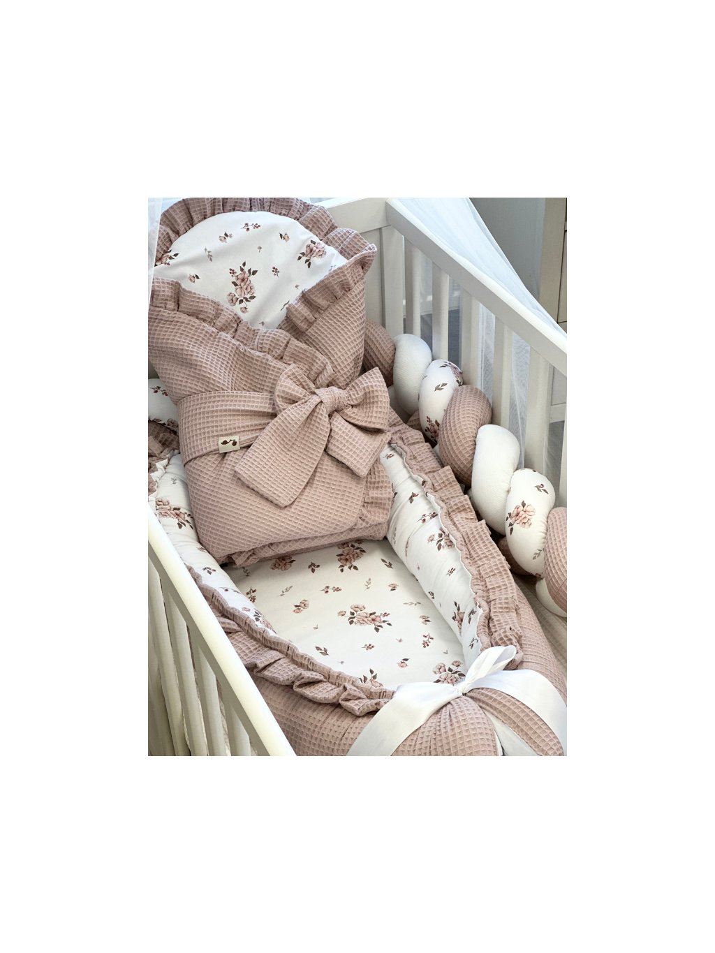 Vaflový, starorůžový set do postýlky se skládá z hnízdečka, zavinovačky (vyberte druh) a copánkového mantinelu dlouhém 1,8 m